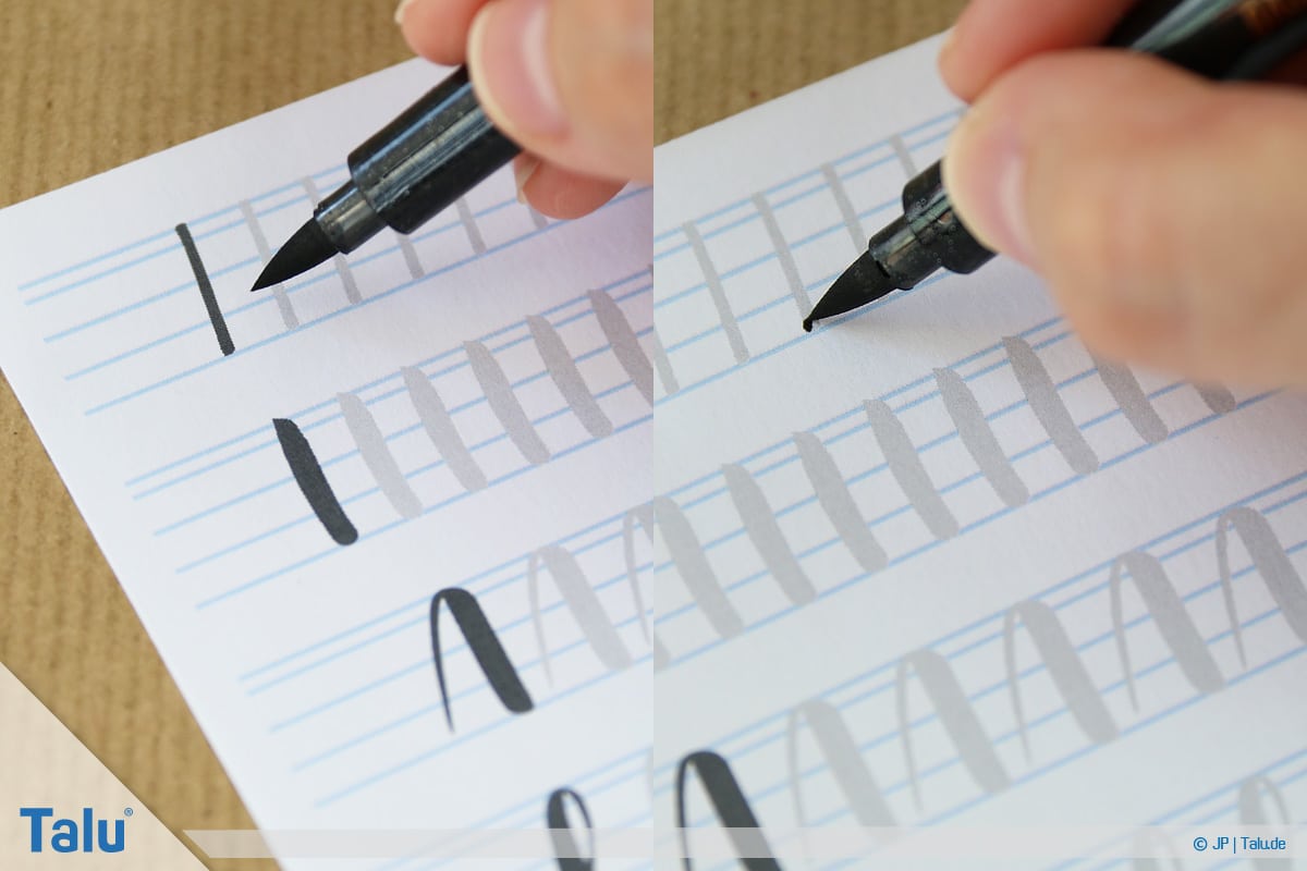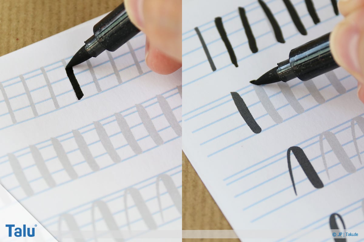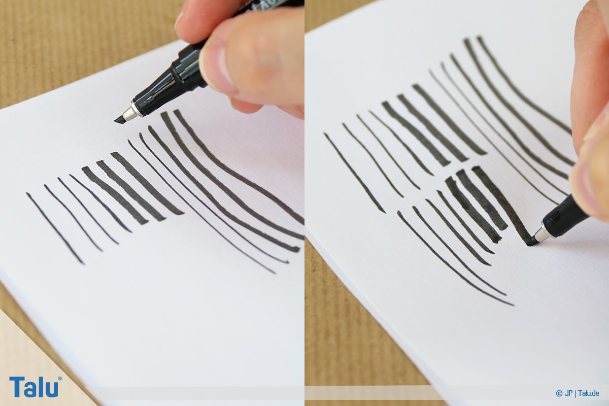 Mehr Druck erzeugt dickere Linien, während Sie mit einer sanften Handführung deutlich dünnere Linien zaubern. Grundsätzlich sind Linien von oben nach unten dicker als von unten nach oben.