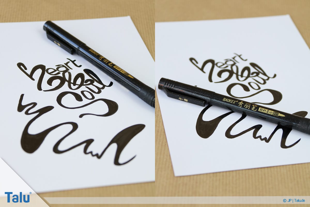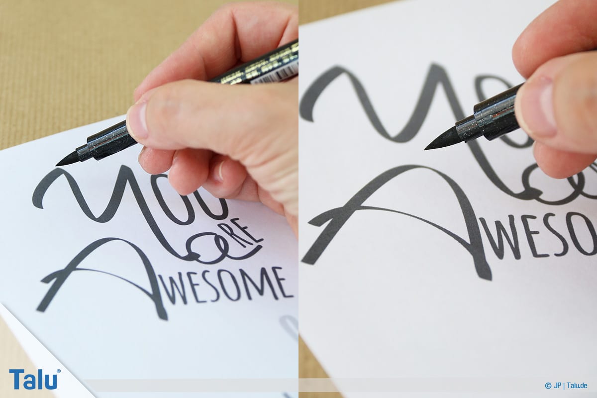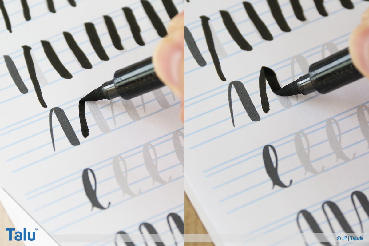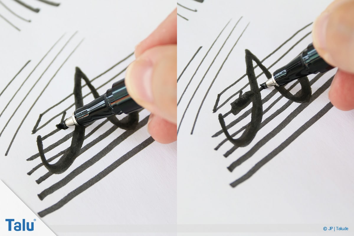 Mehr Druck erzeugt dickere Linien, während Sie mit einer sanften Handführung deutlich dünnere Linien zaubern. Grundsätzlich sind Linien von oben nach unten dicker als von unten nach oben.
