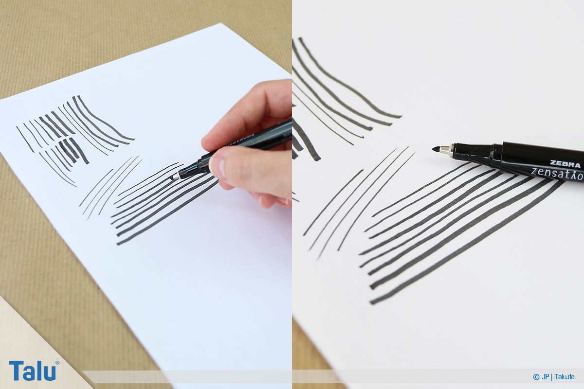Tipp: Falls der Verdacht auf eine beschädigte oder ausgefranste Stiftspitze besteht, betrachten Sie diese von der Seite. Stehen die einzelnen Fasern ab oder ist die Spitze deutlich geknickt, sollten Sie auf ein anderes Papier umsteigen.