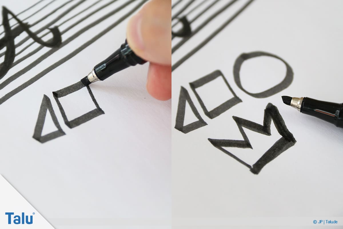 4. Schritt: Nun verbinden Sie Linien miteinander. Das gelingt auf die gleiche Weise wie die klassische Schreibschrift in der Schule. Malen Sie zuerst einen Strich nach unten und führen Sie den Stift in einem Bogen oder spitzen Winkel nach oben. Das gleiche wiederholen Sie dann mit einem Strich von unten nach oben.