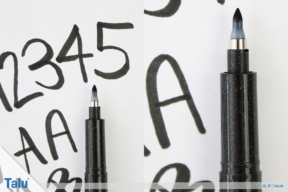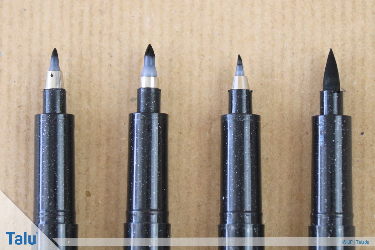 Übersetzt bedeutet das englische Wort „brush“ Pinsel. Das heißt, Sie verwenden Stifte mit einer weichen Spitze, die einem Pinsel ähnelt und somit beim Schreiben nachgibt. Nur dadurch sind geschwungene Linien und unterschiedliche Farbintensitäten möglich, die ein charakteristisches Element der Technik sind. Für den Anfang reichen die folgenden Stifte aus.