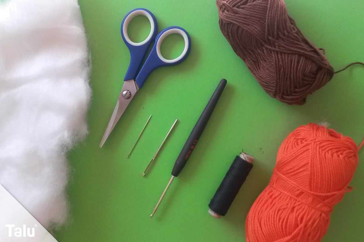 • Häkelgarn (Baumwolle, 50 g/ 125 m): Dunkelbraun, Orange