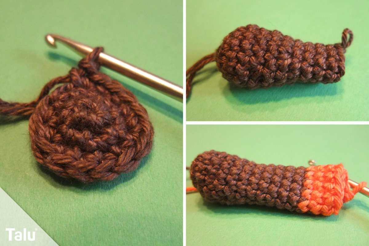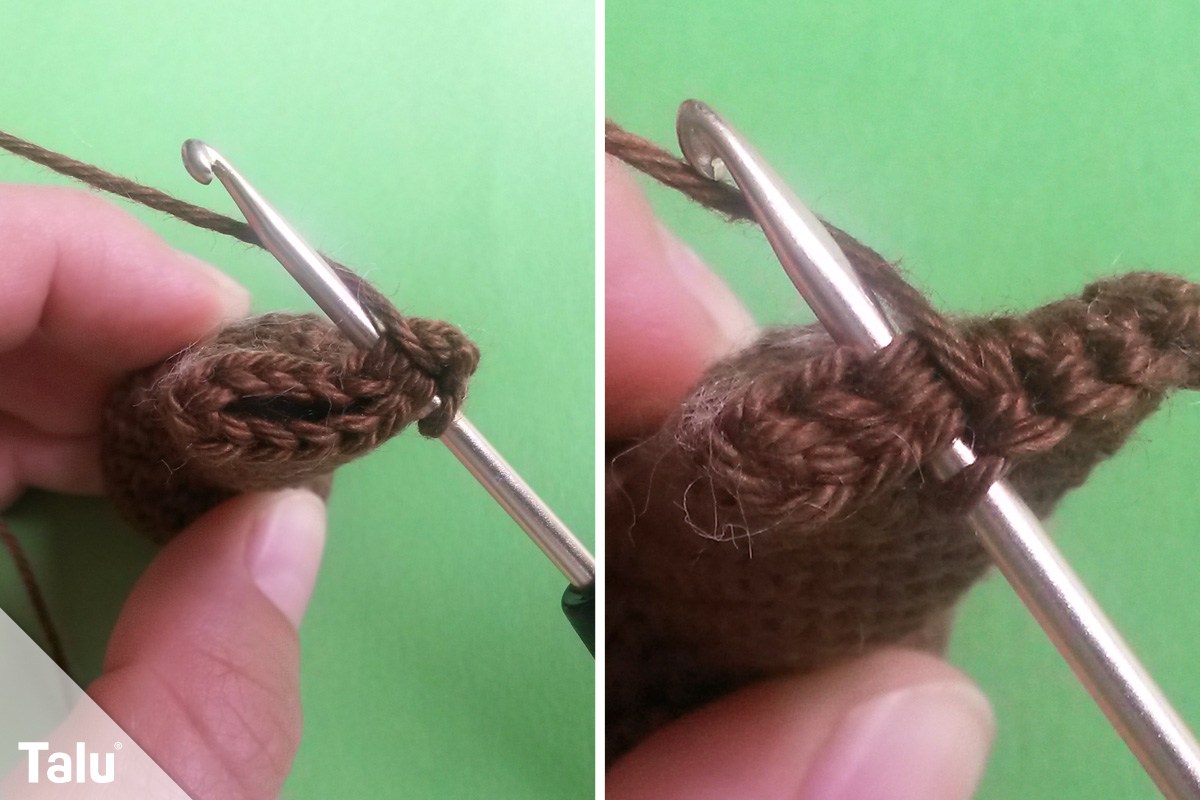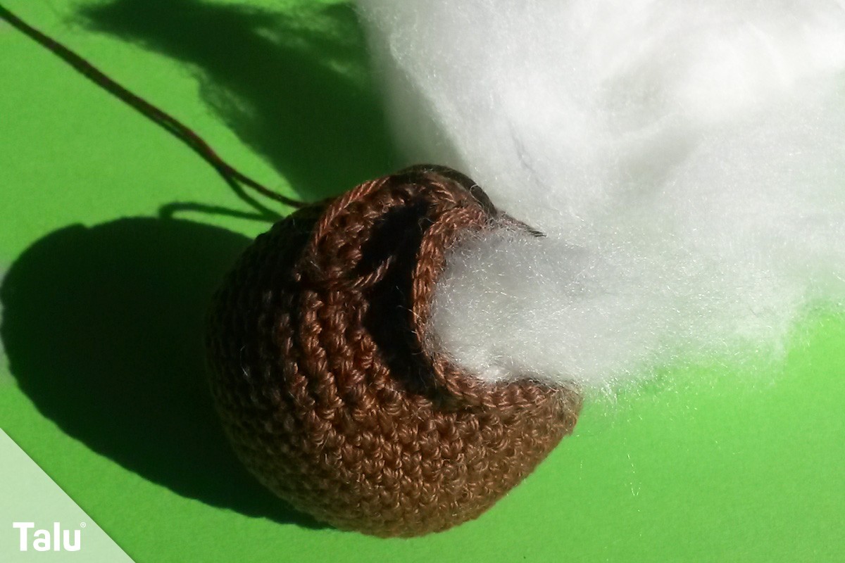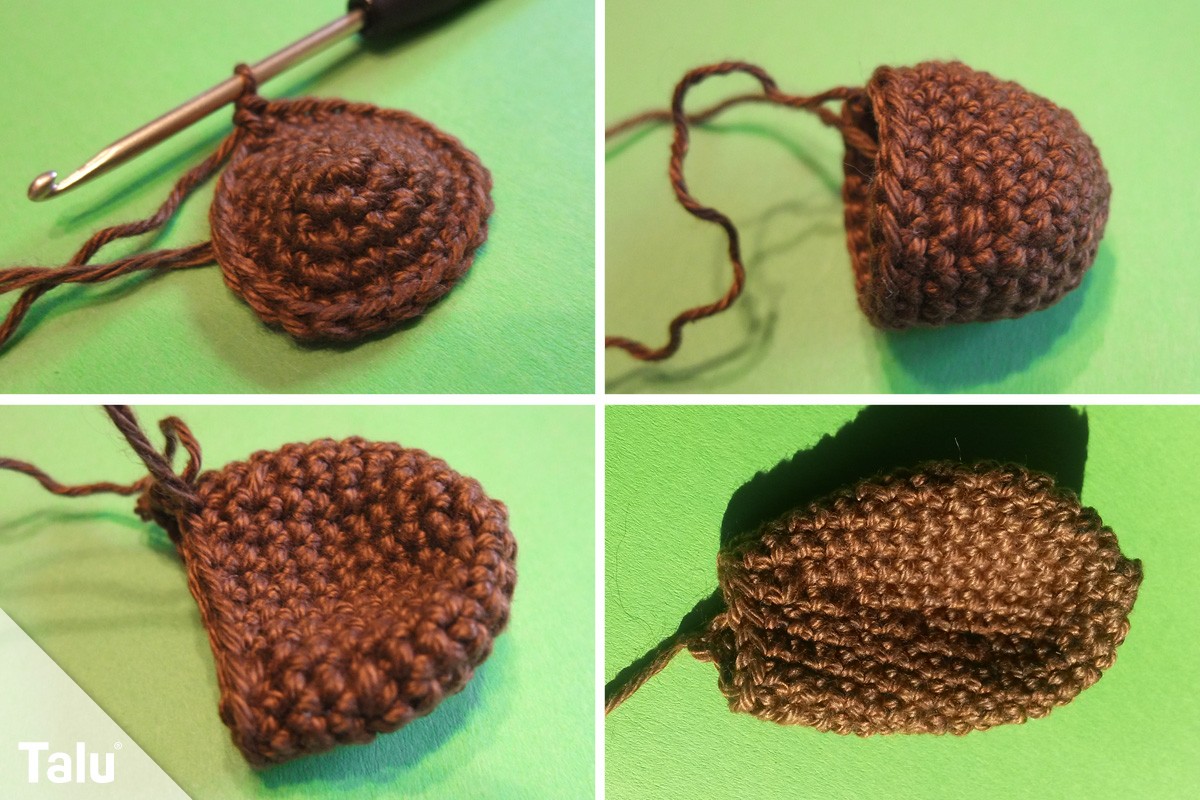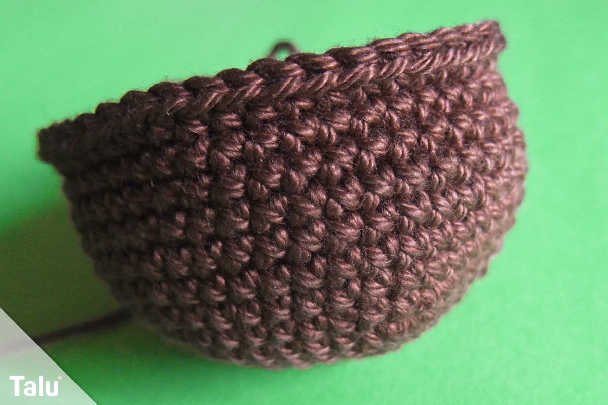 Nehmen Sie das braune Garn. Die erste Runde ist ein Fadenring aus 6 festen Maschen. Es folgt die Verdopplung jeder Masche in der 2. Runde. In der 3. Runde wird jede 2. Masche, in der 4. jede 3. und in der 5. Runde jede 4. Masche verdoppelt. Es folgen 2 Runden, in denen Sie je eine feste Masche in jede der 30 Maschen häkeln. In der 8. Runde häkeln Sie jede 4. und 5. Masche zusammen.