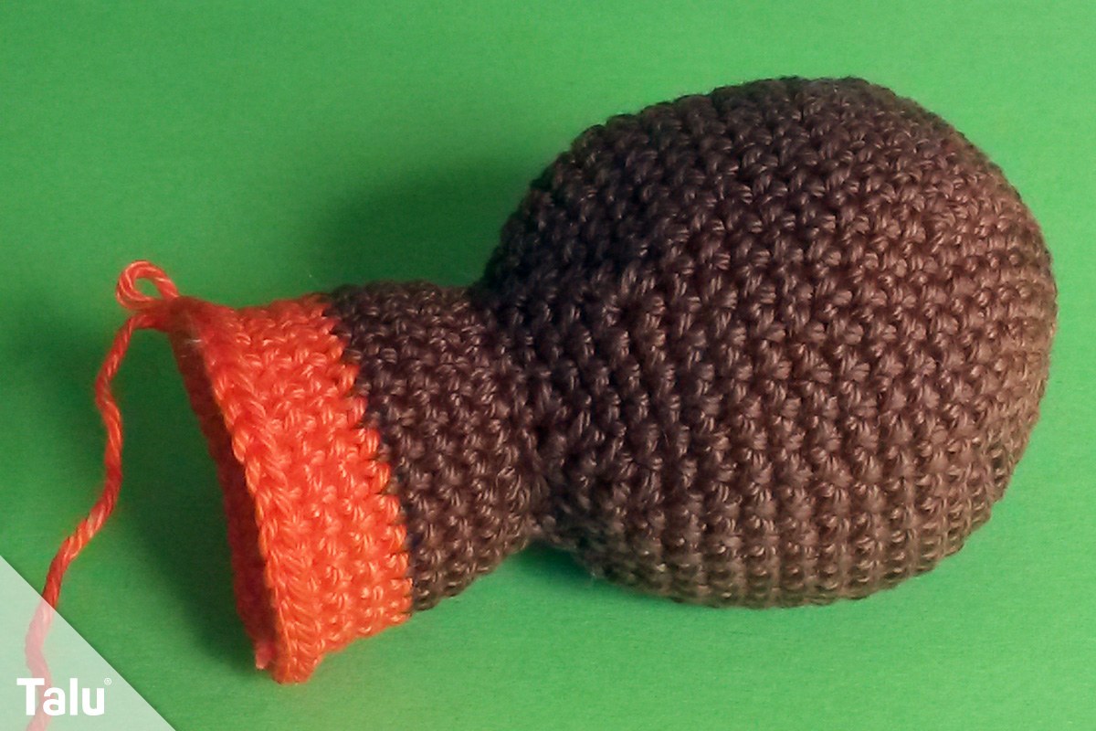 Nun nehmen Sie wieder Maschen zu. Dafür häkeln Sie zuerst 2 feste Maschen in jede Masche, was zu 30 Maschen führt. Häkeln Sie nun über 2 Runden je eine feste Masche pro Masche. Dann wechseln Sie von dem braunen Garn zum orangefarbenen Garn bzw. zu der Farbe Ihrer Wahl. Es folgen 3 weitere Runden Masche in Masche.