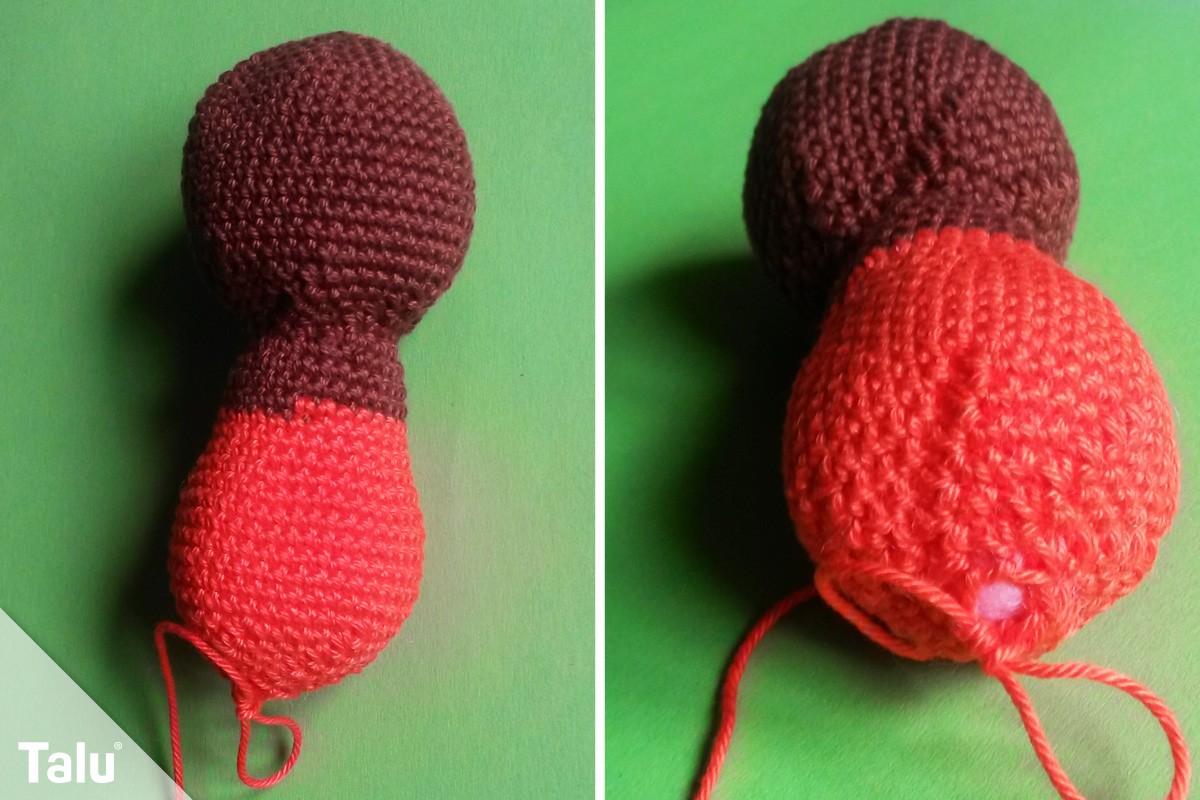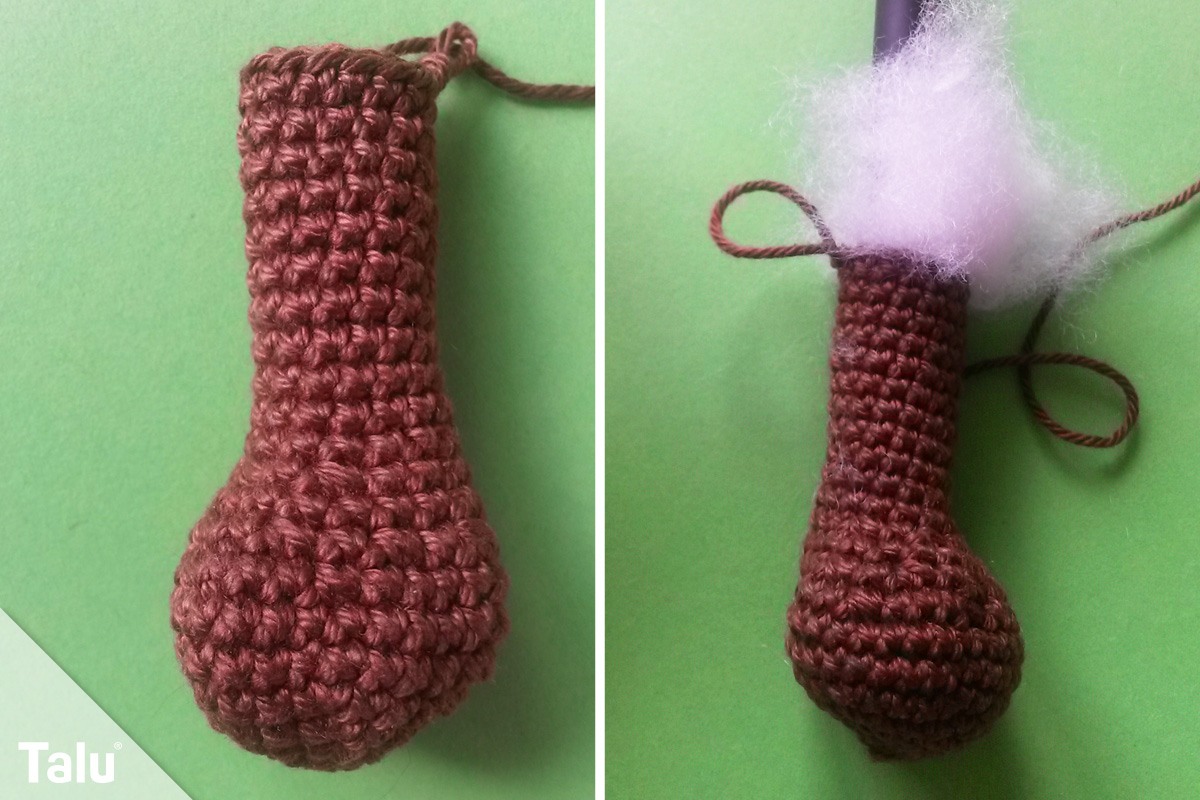 Das übrige Bein häkeln Sie mit einer festen Masche pro Masche über 11 Runden. Abschließend stopfen Sie das Bein mit Füllmaterial aus.