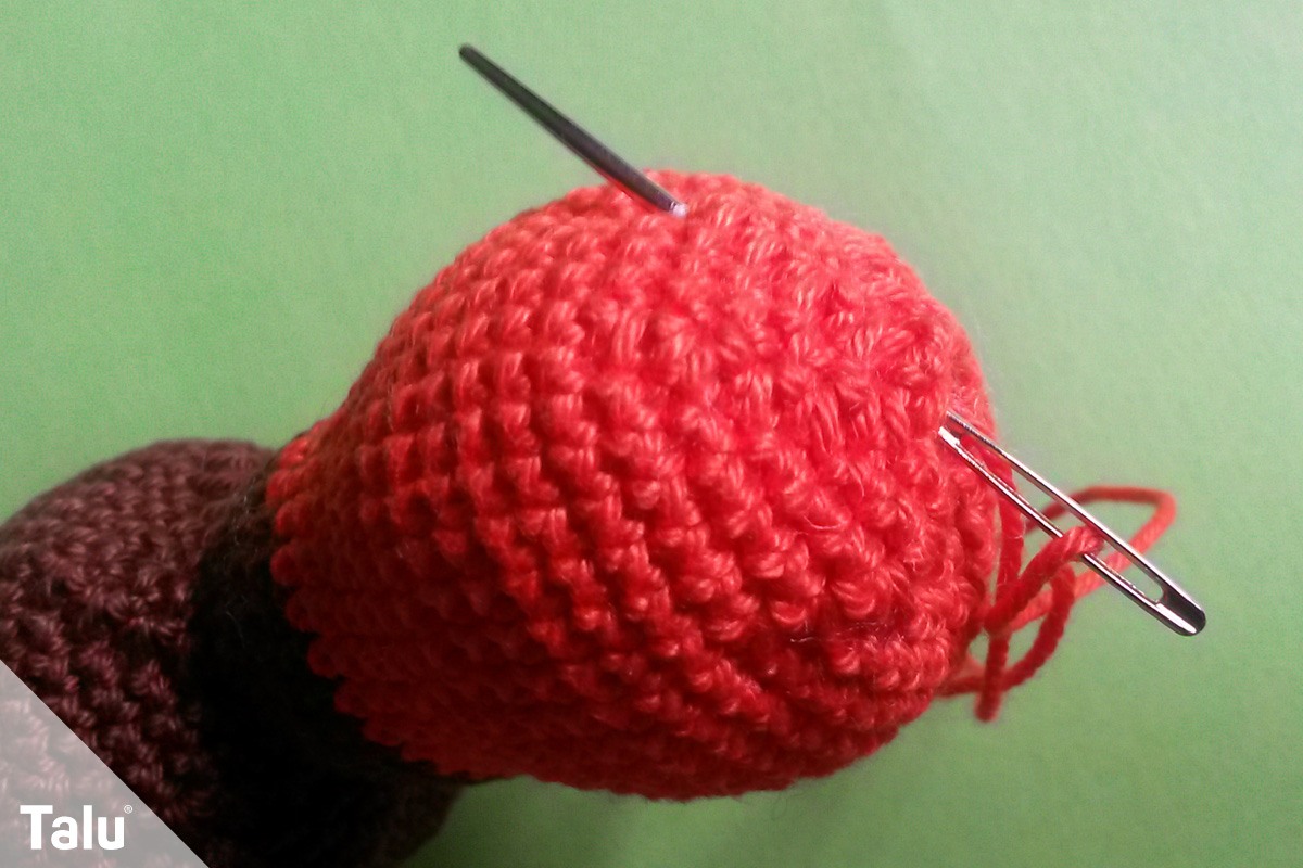 Ist der Körper gefüllt, häkeln Sie in der 41. Runde jede 2. und 3. Masche und in der 42. Runde jede 1. und 2. Masche zusammen. Es sind nun 6 Maschen übrig. Schneiden Sie den Arbeitsfaden mit ca. 20 cm Überstand ab und ziehen ihn durch die letzte Masche hindurch.