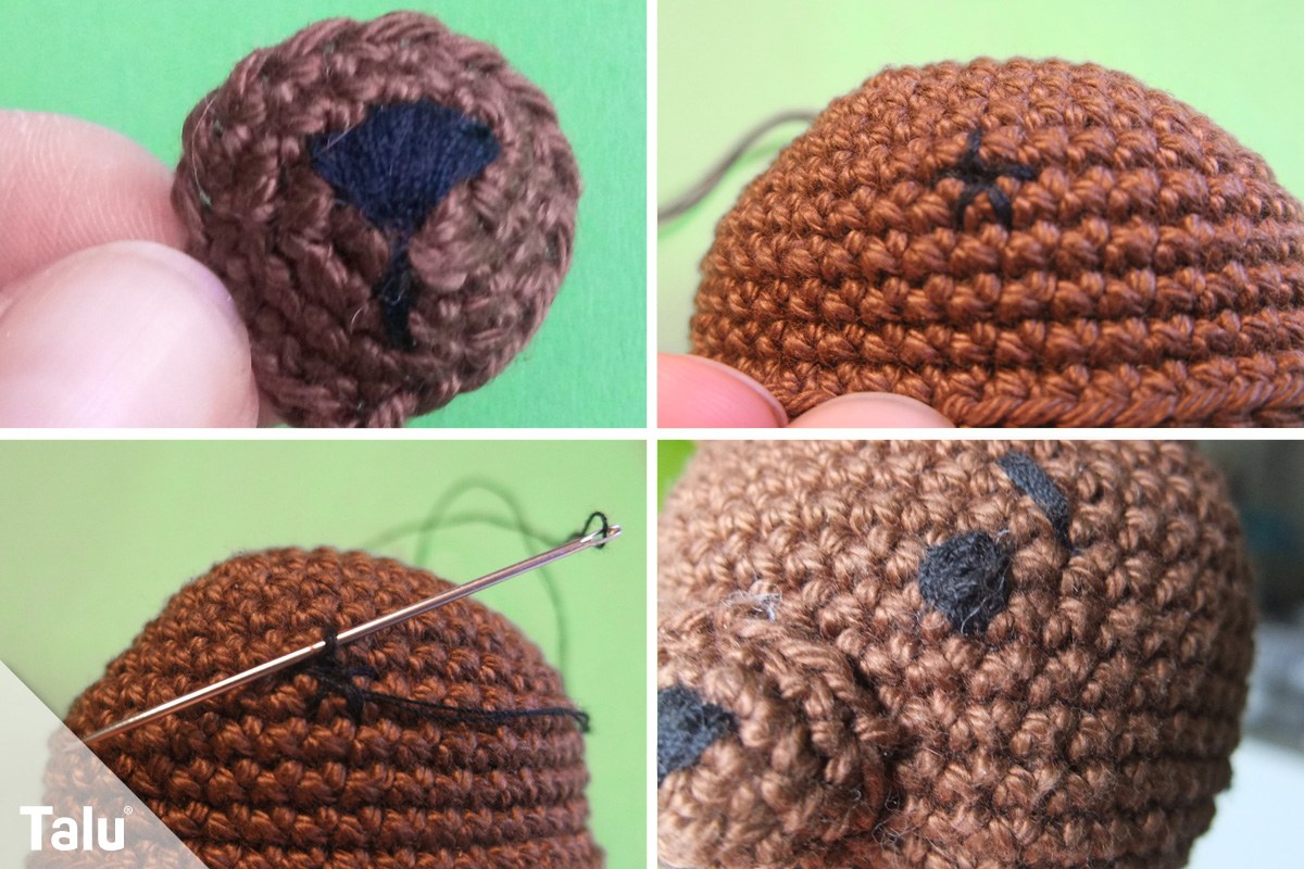 In dieser Anleitung sticken wir die Augen auf. Für Amigurumis ist es auch üblich, Sicherheitsaugen oder Amigurumi-Augen zum Annähen zu verwenden. Die Entscheidung liegt bei Ihnen und hängt auch sehr davon ab, was Ihnen optisch mehr zusagt.