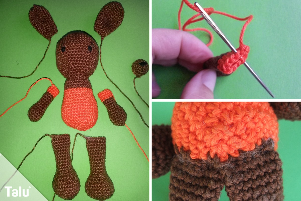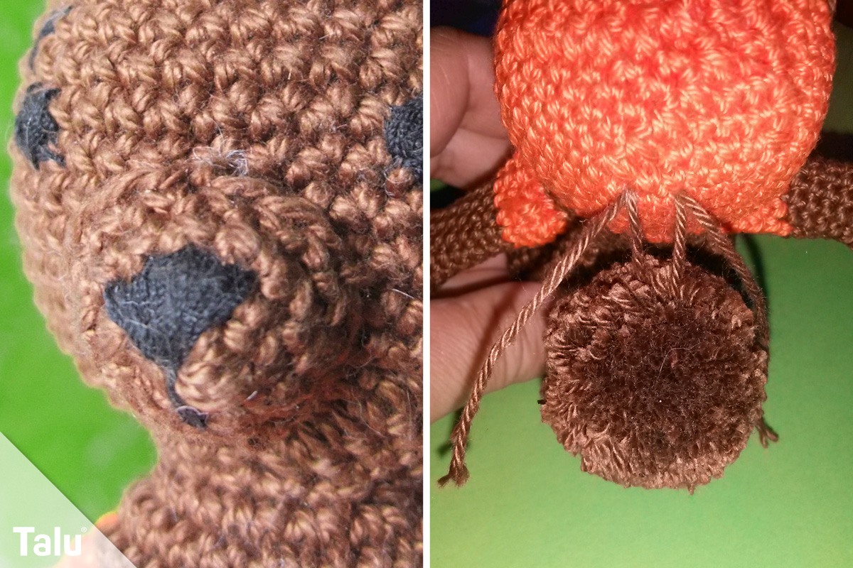 Auch die Arme beginnen mit dem braunen Garn und einem Fadenring mit 6 festen Maschen. In der 2. Runde häkeln Sie 2 Maschen in jede Masche und in der 3. Runde 2 Maschen in jede 4. Masche. Jetzt kommt eine Runde Masche pro Masche. In der 5. Runde häkeln Sie jede 4. und 5. Masche zusammen, in der 6. Runde folgt wieder eine Masche pro Masche. Nun häkeln Sie jede 5. und 6. Masche zusammen. Dann geht es weiter mit 6 Runden, in denen Sie je eine feste Masche in jede Masche häkeln. Wechseln Sie die Farbe und häkeln mit Orange 3 weitere Runden eine Masche pro Masche.