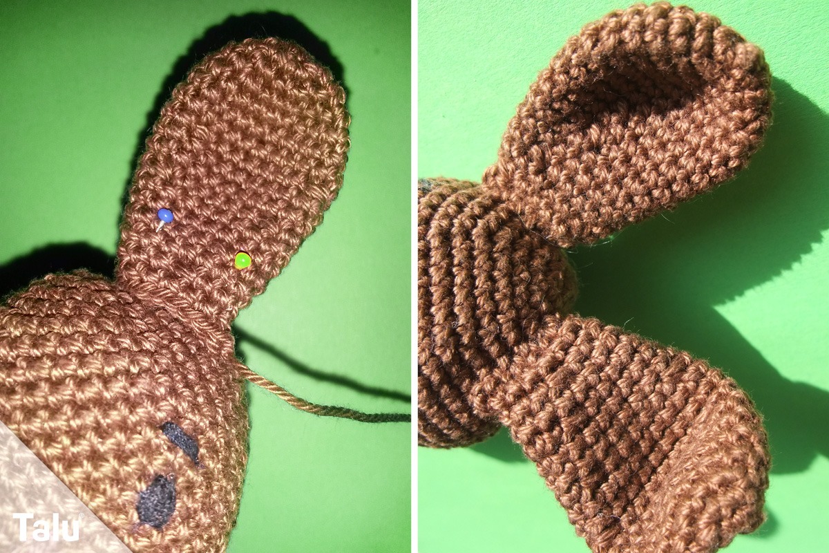 Der Hase hat seine Ohren in 1 cm Abstand zueinander nahezu mittig zwischen Gesicht und Hinterkopf. Tendenziell geht die jeweils äußere Kante nach vorne Richtung Gesicht. Ziehen Sie den Faden beim Annähen ordentlich fest, damit die Ohren stehen bleiben.