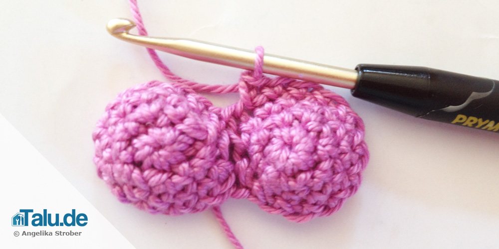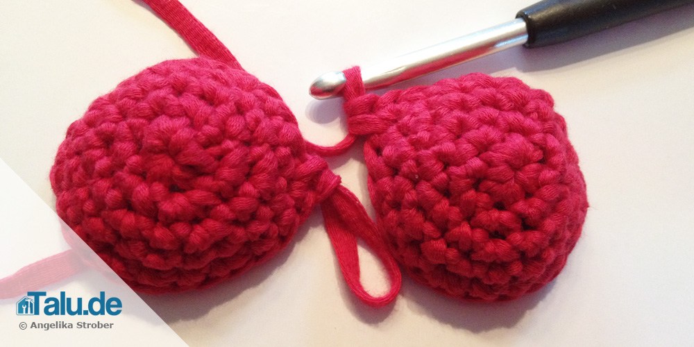 Anschließend auf das zweite Käppchen überspringen und 12 Maschen rund um dieses Käppchen häkeln. Die beiden Käppchen sind jetzt verbunden und sehen aus wie ein klitzekleiner Miniatur-BH.