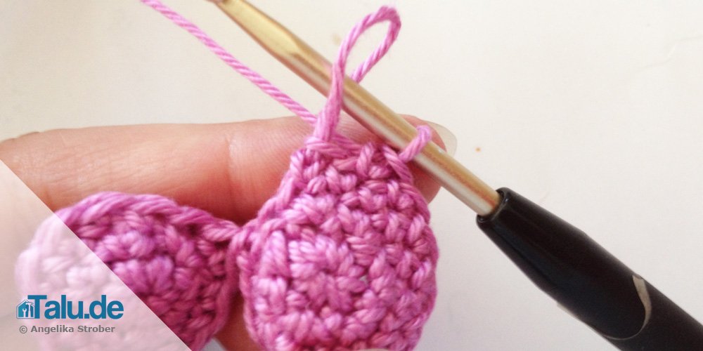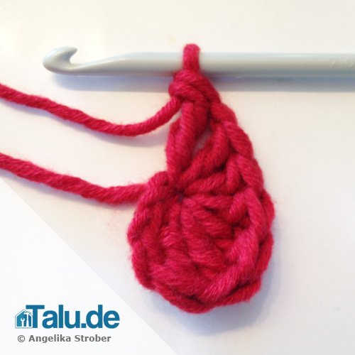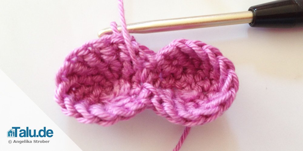 Eine feste Masche häkeln und ausgehend von dieser Masche das linke Käppchen umhäkeln (11 Maschen) und als 12. Masche die langgezogene Schlaufe des Käppchens verwenden.