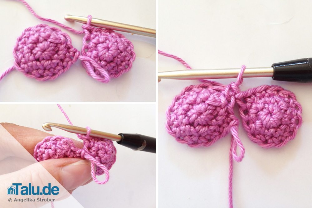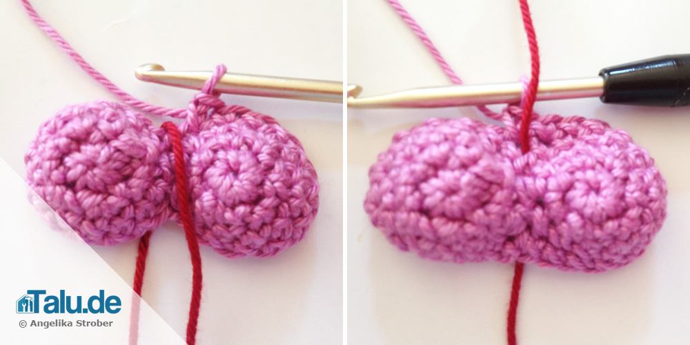 Zuerst müssen die beiden Käppchen verbunden werden. Im rechten Käppchen (zweites Käppchen) steckt noch die Häkelnadel. Das linke Käppchen so in die Hand nehmen, dass der Arbeitsfaden des rechten Käppchens direkt an das linke Käppchen angehäkelt werden kann. Die erste Einstichstelle ist der Maschenkopf, der sich links von der langgezogenen Schleife befindet.