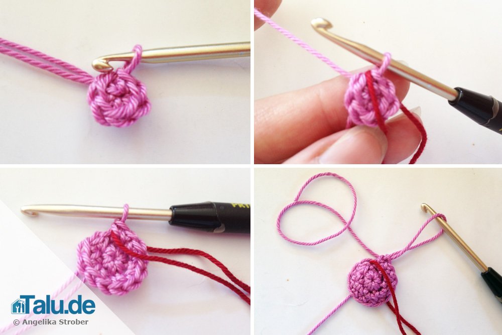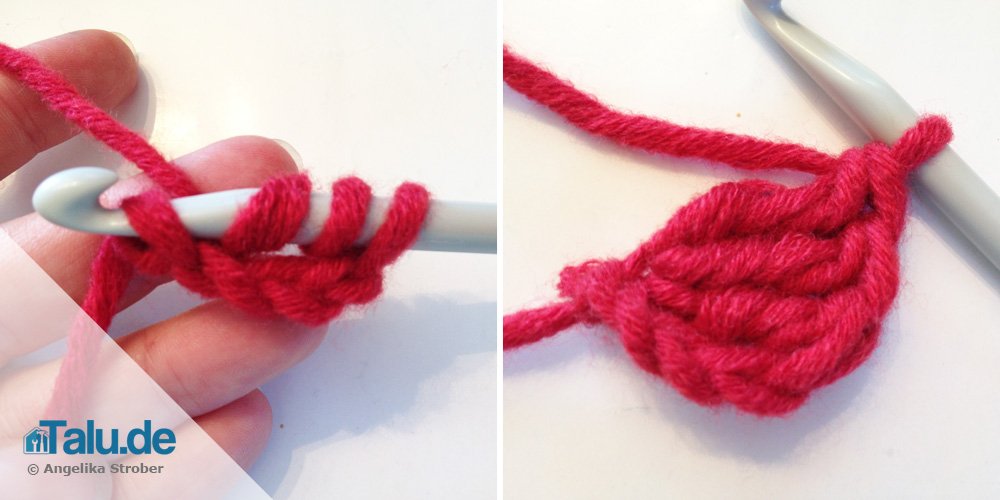 Die Arbeit beginnt mit vier Luftmaschen. In die erste Luftmasche werden nun drei Doppelstäbchen gehäkelt: zwei Schlaufen auf die Nadel holen, und in die erste Luftmasche (wo der Anfangsfaden hängt) einstechen, Doppelstäbchen beenden, noch zwei Doppelstäbchen in dieselbe Einstichstelle häkeln.