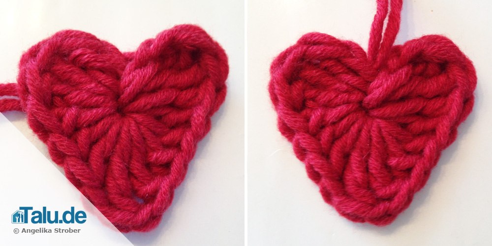 Die beiden Fäden vernähen oder durch die entstandene Herzmitte nach oben ziehen. Dann können sie gleich als Aufhänger oder Schleife benutzt werden.