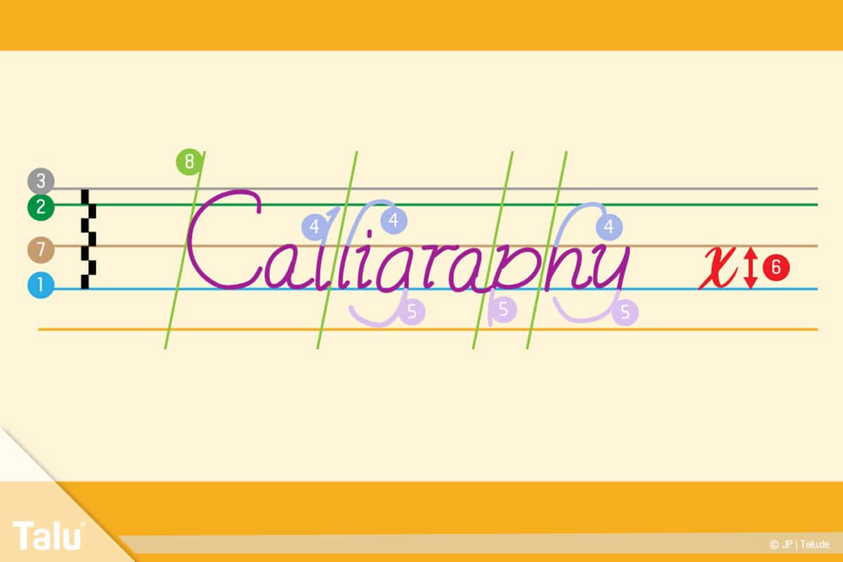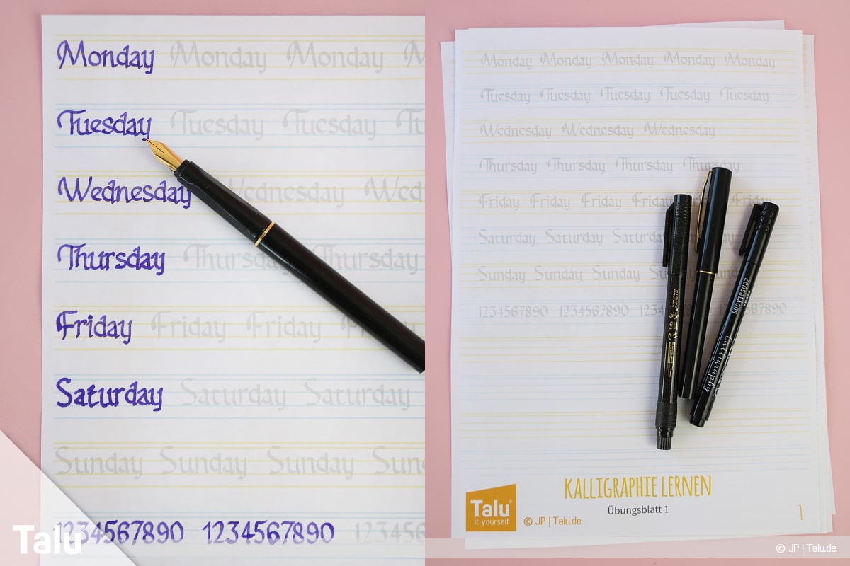 Kalligraphie lernen, Anleitung für Anfänger, ausgedruckte Übungsblätter von talu-de.pro