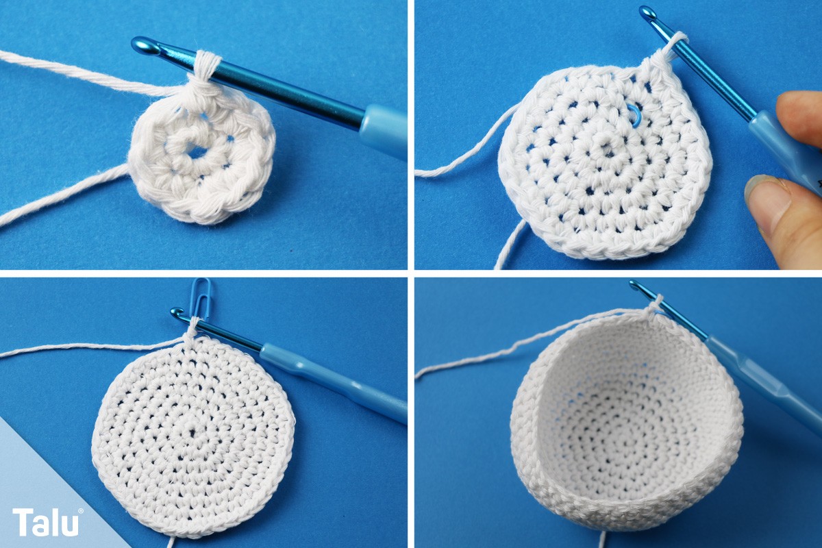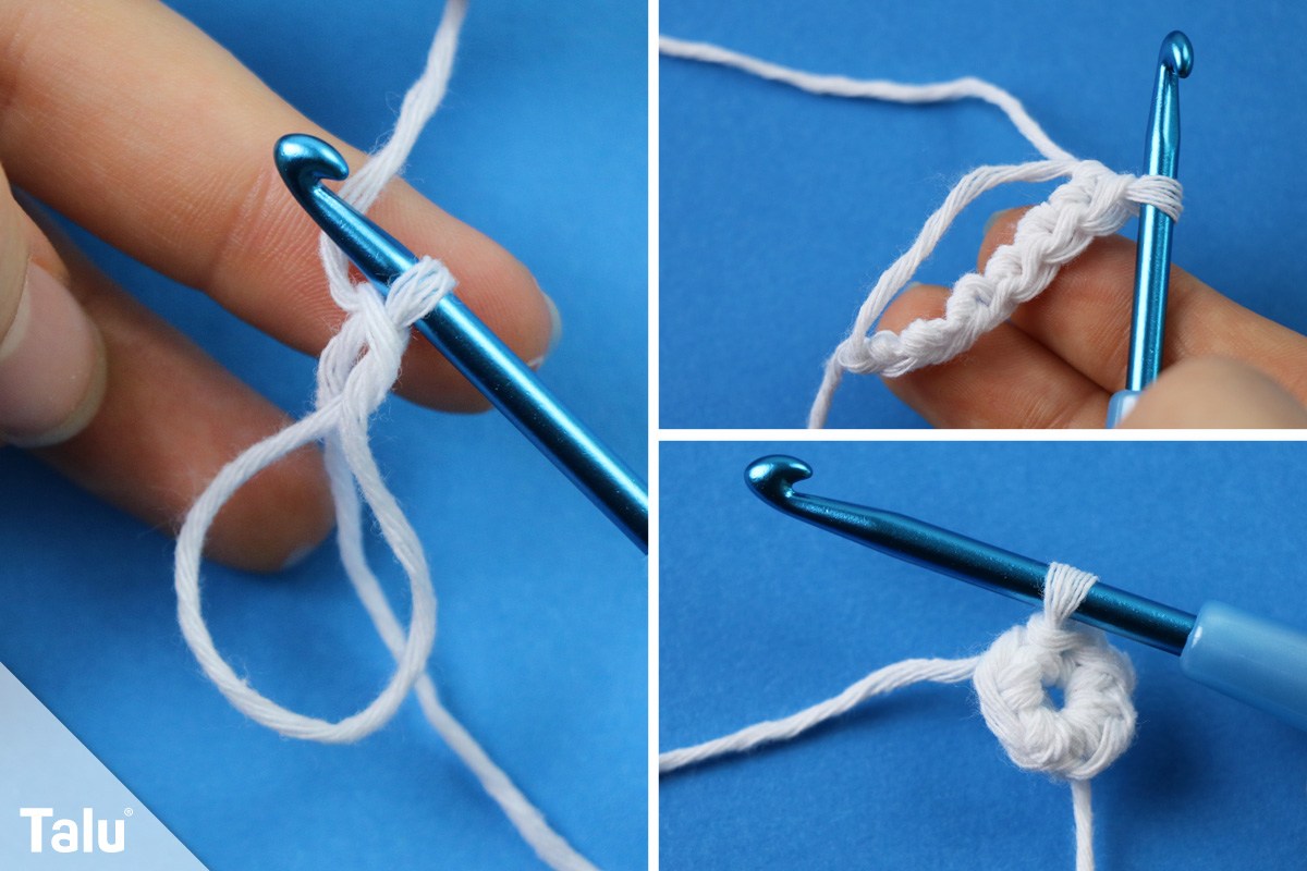 1. Reihe: Starten Sie mit einem Fadenring, in den Sie 6 feste Maschen häkeln (6 Maschen).