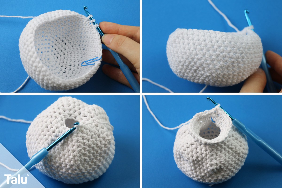 Von jetzt an häkeln Sie weiter in festen Maschen und nehmen in jeder Runde zwei Maschen ab, indem Sie die Maschen in den Knicken miteinander abmaschen. Durch die vorherige Reihe müssten Sie eigentlich genau erkennen, wo das sein wird. Sie müssen also nicht immer mitzählen. Nach der dritten Reihe zählt die Reihe nur noch 14 Maschen. Diese werden von Reihe zu Reihe immer um 2 Maschen weniger: 12 Maschen, 10 Maschen, 8 Maschen, usw.