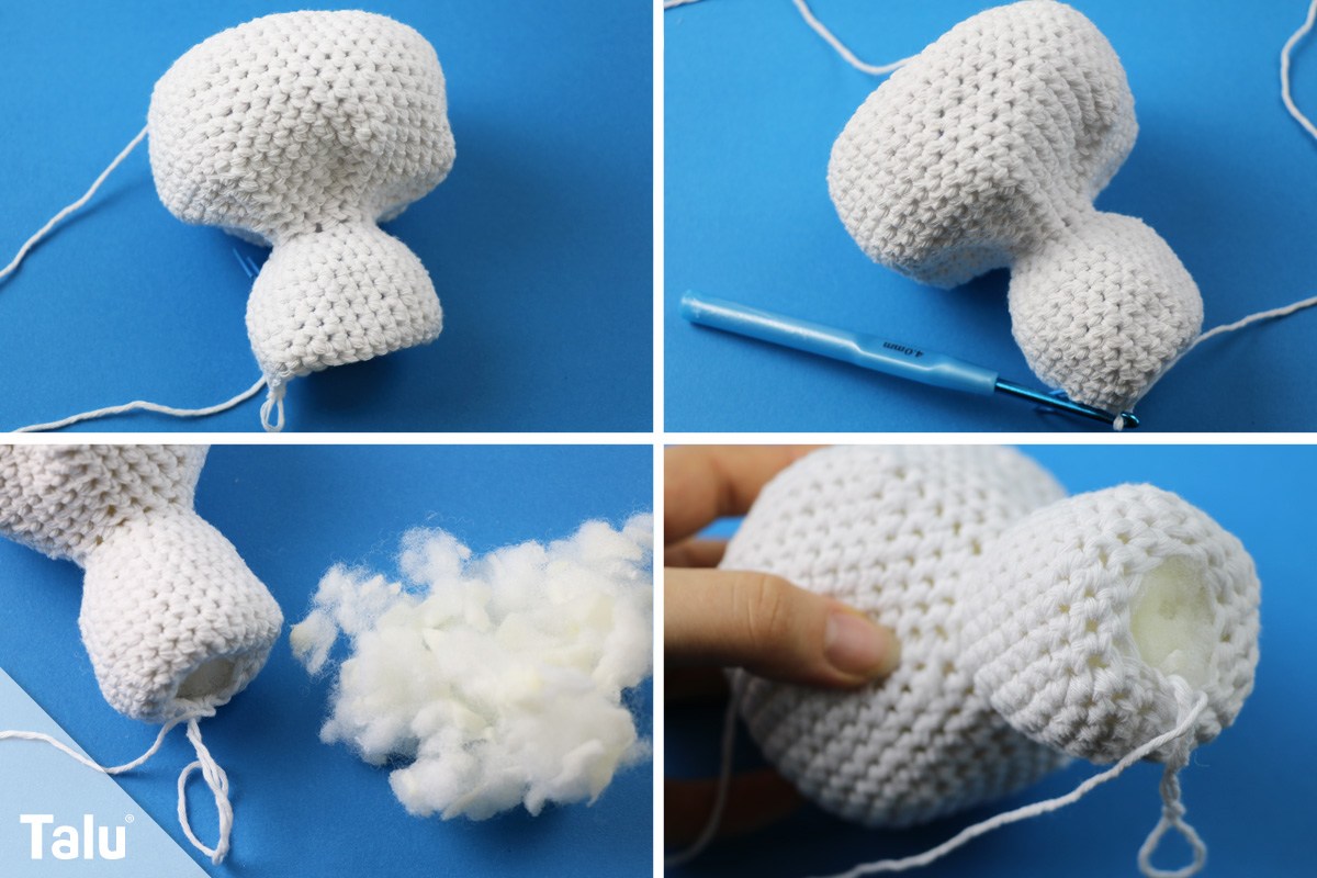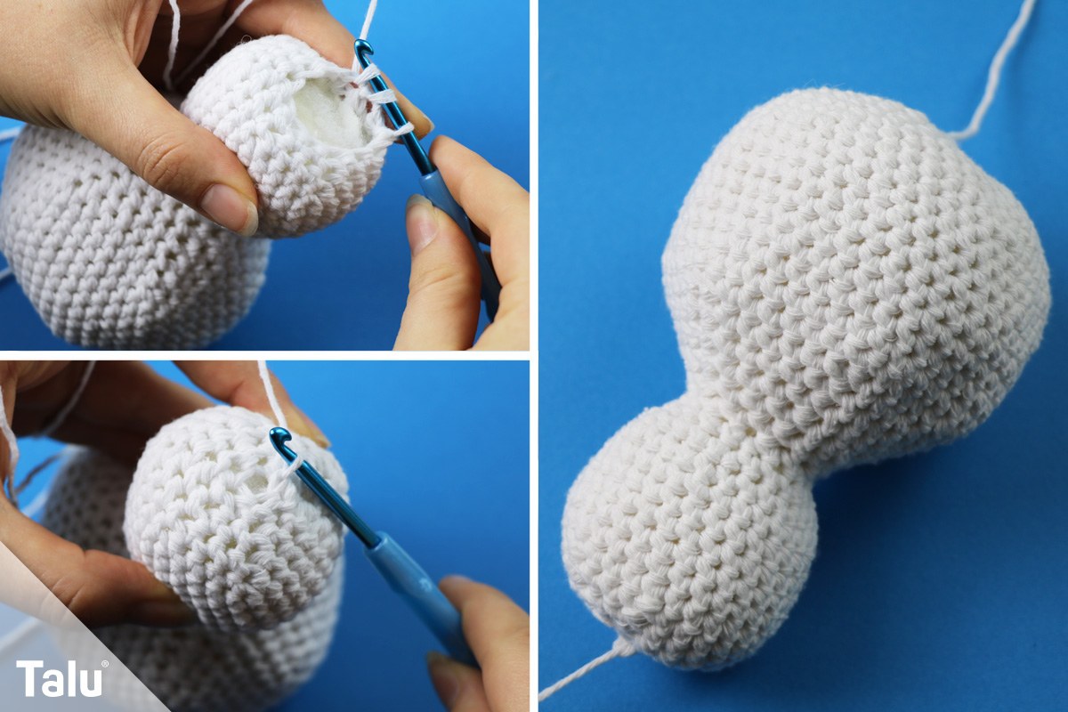 Anschließend wird der Körper geschlossen. Dafür häkeln Sie die restlichen Maschen einfach zusammen und schneiden die Faden großzügig ab.