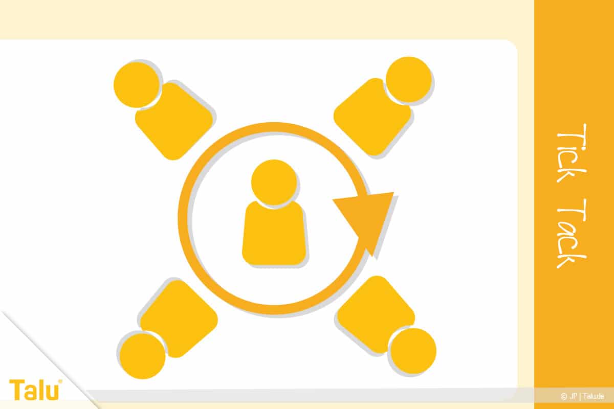 Alle sitzen im Kreis, während sich einer der Spielenden in der Mitte befindet. Dieser zeigt ganz plötzlich auf einen der Sitzenden und sagt Tick oder Tack. Bei Tick muss der Angesprochene schnell den Namen seines linken Nachbarn sagen, bei Tapp jenen des rechten.
