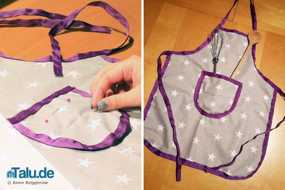 Stecken Sie die Tasche auf der Schürze fest und nähen Sie diese anschließend an.