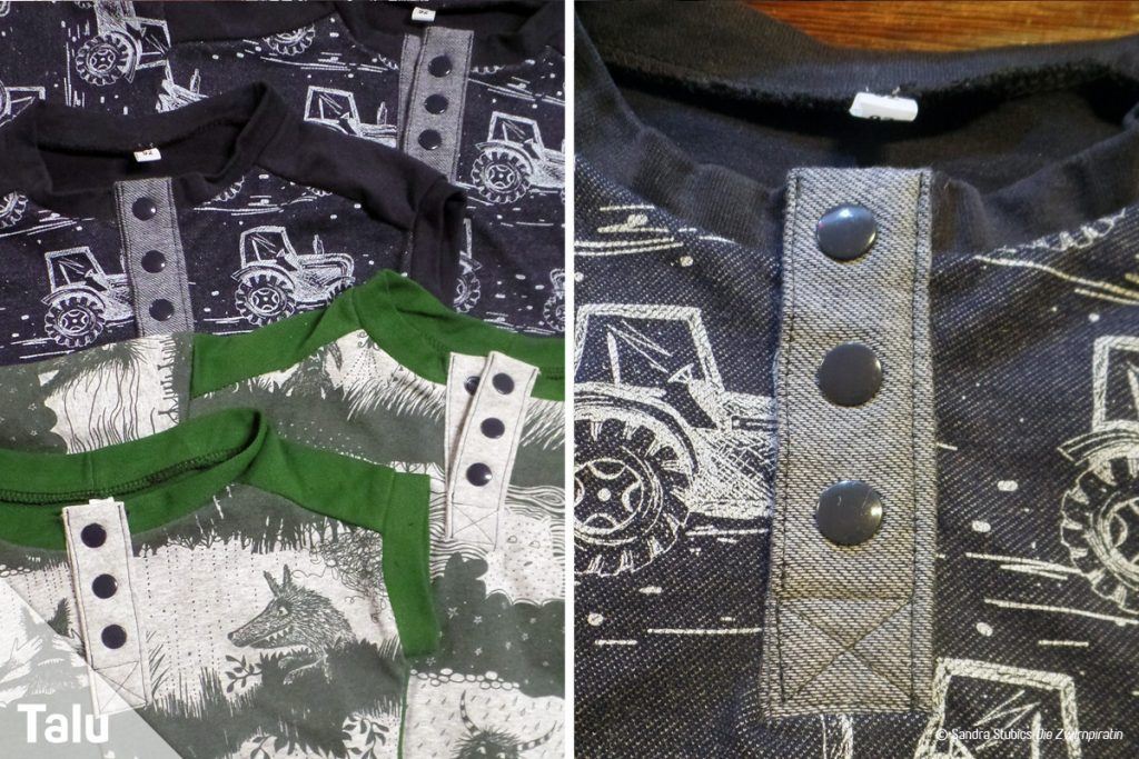 Gerade wenn man mal keinen Bündchenstoff in der passenden Farbe zu Hause hat und einfach ein Bündchen aus Jerseystoff machen möchte, kann es passieren, dass es nicht die richtige Weite hat. Das liegt vor allem daran, dass viele Jerseystoffe unterschiedliche Zusammensetzungen haben und daher unterschiedlich dehnbar sind – immer jedoch weniger dehnbar als Bündchenstoffe. Falls es zu groß ist, hilft ohnehin nur auftrennen und ein engeres Bündchen annähen. Wenn es aber zu eng wurde, sodass der Kopf des Kindes nicht angenehm hindurchpasst, die Weite des Ausschnitts am Hals dann aber doch gut aussieht, kann man sich mit diesem Tutorial für einen Poloverschluss helfen.