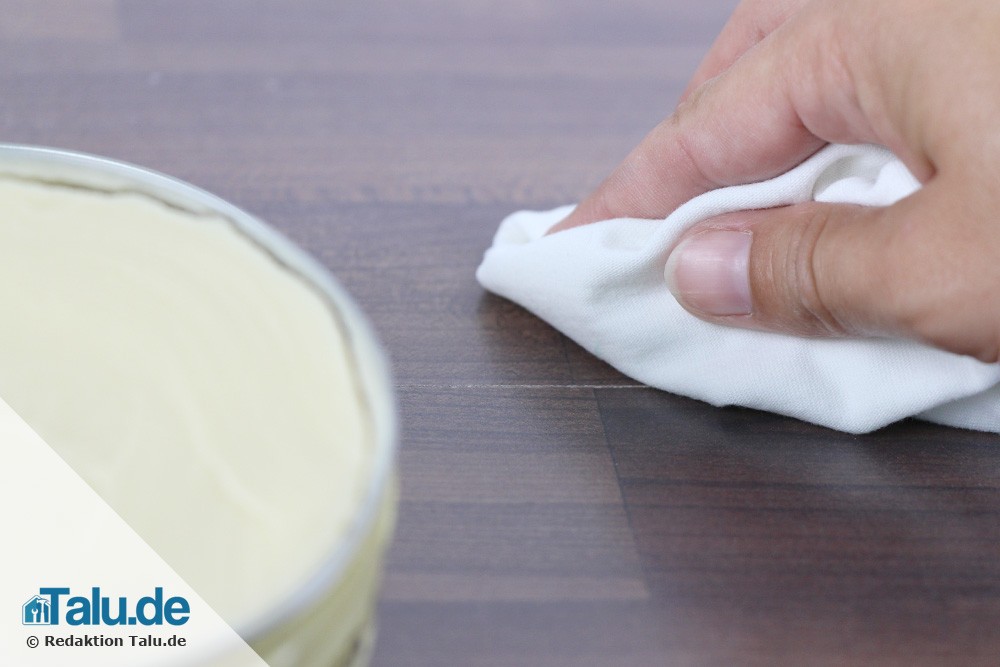 Die Versiegelung muss sehr gründlich eingearbeitet werden, das kann durchaus etwas Arbeit machen. Viele Haushaltstipps empfehlen immer wieder, etwas Essig ins Wischwasser zu geben, um Schlieren beim Wischen zu verhindern. Doch der Essig laugt das Laminat aus, beziehungsweise zieht die mühsam aufgetragene Versiegelung wieder aus dem Bodenbelag. Daher sollten Sie Essig höchstens für die Reinigung vor der Versiegelung nutzen, um Fettschmutz zu entfernen.