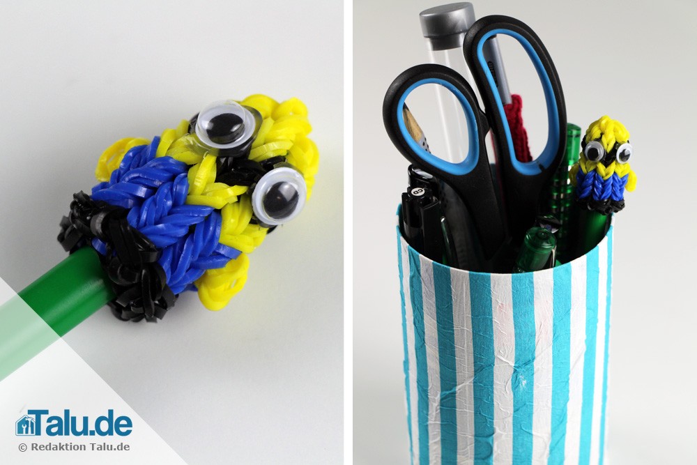 Sie möchten damit Ihre Stifte aufpeppen, dann zeigen wir Ihnen hier eine Anleitung wie Sie schnell Ihren eigenen Loom Minion fertigen können. Dieses Projekt eignet sich auch für Anfänger. Es wird nicht viel Material benötigt und in nur ungefähr 20 Minuten fertigt man seinen individuellen Loom Minion selbst.