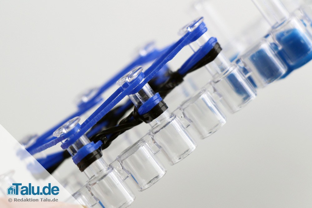 So mit allen weiteren Stiften vorgehen. Nach dem Loomen sind auf jedem Stift jeweils zwei schwarze und zwei blaue Loombänder zu sehen.