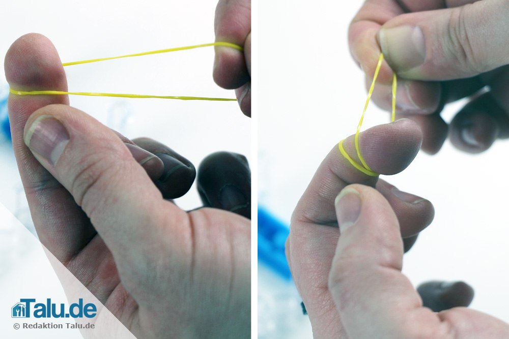 Zwei gelbe Gummibänder zu einem Ärmchen verbinden