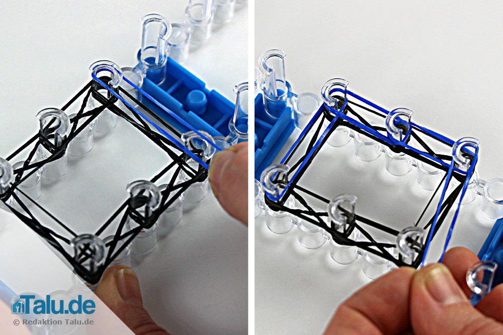 Aufspannen der Loom Bandz zu einem Viereck5. Wiederholen Sie Punkt 4, nur diesmal mit sechs blauen unverdrehten Gummibändern, siehe vorheriges Bild rechts.