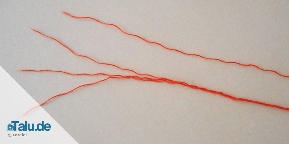 Ein weiterer Hinweis bezieht sich auf die Dicke des Stickfadens. Bedenken Sie, dass der Stickfaden zusätzlichen Platz im Gestrick benötigt. Je dicker er ist, desto stärker presst er die Masche, die er umschließt, zusammen. Die meisten Wollfäden sind verzwirnt – das bedeutet, dass mehrere einzelne Wollfäden miteinander zu einem einzigen Faden verdreht wurden. Der Stickfaden sollte in jedem Fall dünner als die verstrickte Wolle sein. Ihren Stickfaden können Sie daher teilen, sodass er die passende Dicke hat. Ziehen Sie einen oder mehrere Fäden aus dem Stickfaden heraus, damit verringert sich sein Volumen. Manchmal ist es ratsam, mit der entsprechenden Dicke einige Testmaschen zu sticken, um sich einen optischen Eindruck zu verschaffen. In den meisten Fällen reicht das Entfernen von einem oder zwei Einzelfäden und die Maschenstichdicke ist perfekt.