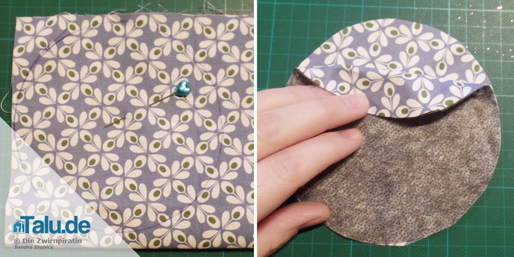 Legen Sie nun beide Kreise rechts auf rechts (also mit den „schönen“ Seiten zueinander) aufeinander und stecken Sie diese wieder mit einer oder mehreren Stecknadeln zusammen. Nähen Sie nun mit einem Geradstich rundherum und lassen Sie einige Zentimeter für die Wendeöffnung aus.