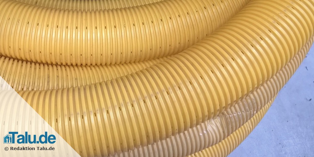 Die Drainagerohrleitung muss mit mindestens 20 Zentimeter Sickermaterial umgeben werden. Hierfür eignen sich unter anderem Schlackengranulat oder Betonkies.