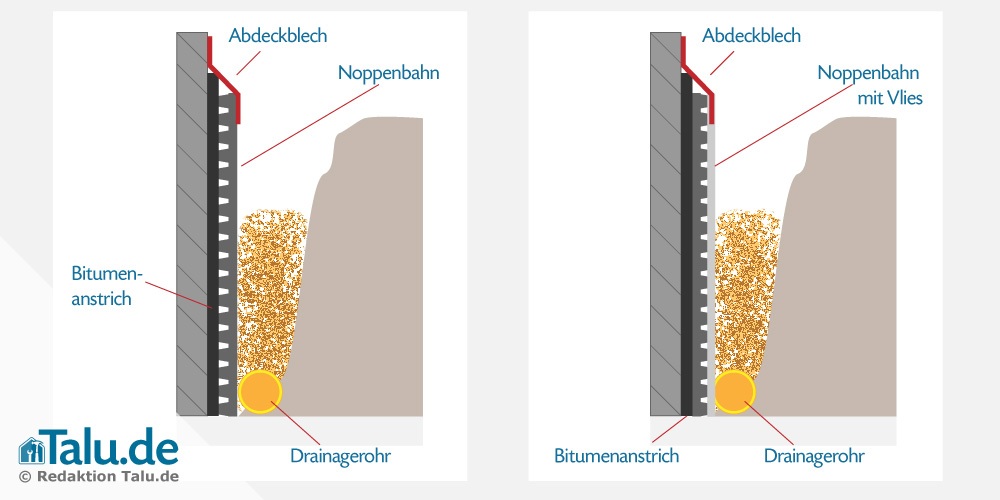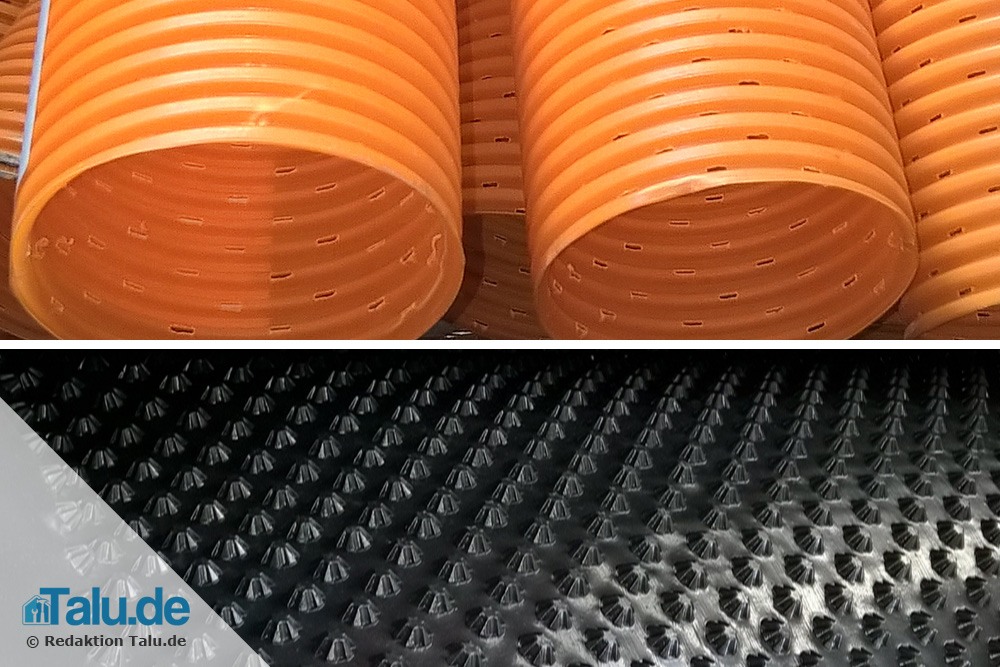 1. Durch die Noppenfolie wird das Wasser durch die Drainagerohre abgeleitet.