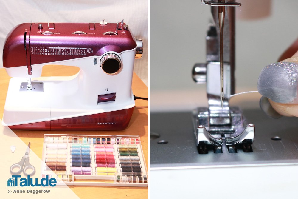 Unsere hier verwendete Nähmaschine ist von der Firma Silvercrest und im Laden schon ab 99,- Euro erhältlich. Natürlich gibt es bei den verschiedenen Modellen Unterschiede, wie die Fäden richtig einzulegen sind, aber das Prinzip ist bei allen Maschinen dasselbe.
