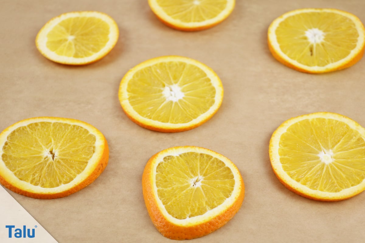 Optional: Steht eine Mikrowelle zur Verfügung, lassen sich die Apfelsinenscheiben vorweg kurz vorgaren. Bei 900 Watt genügen zweieinhalb Minuten pro Seite. Danach noch einmal mit Küchenpapier abtupfen. Die Mikrowelle entzieht den Orangen viel Feuchtigkeit und lässt damit späterer Fäulnis absolut keine Chance. Ansonsten genügt aber auch der Backofen vollkommen. Die Garzeit verlängert sich lediglich etwas.