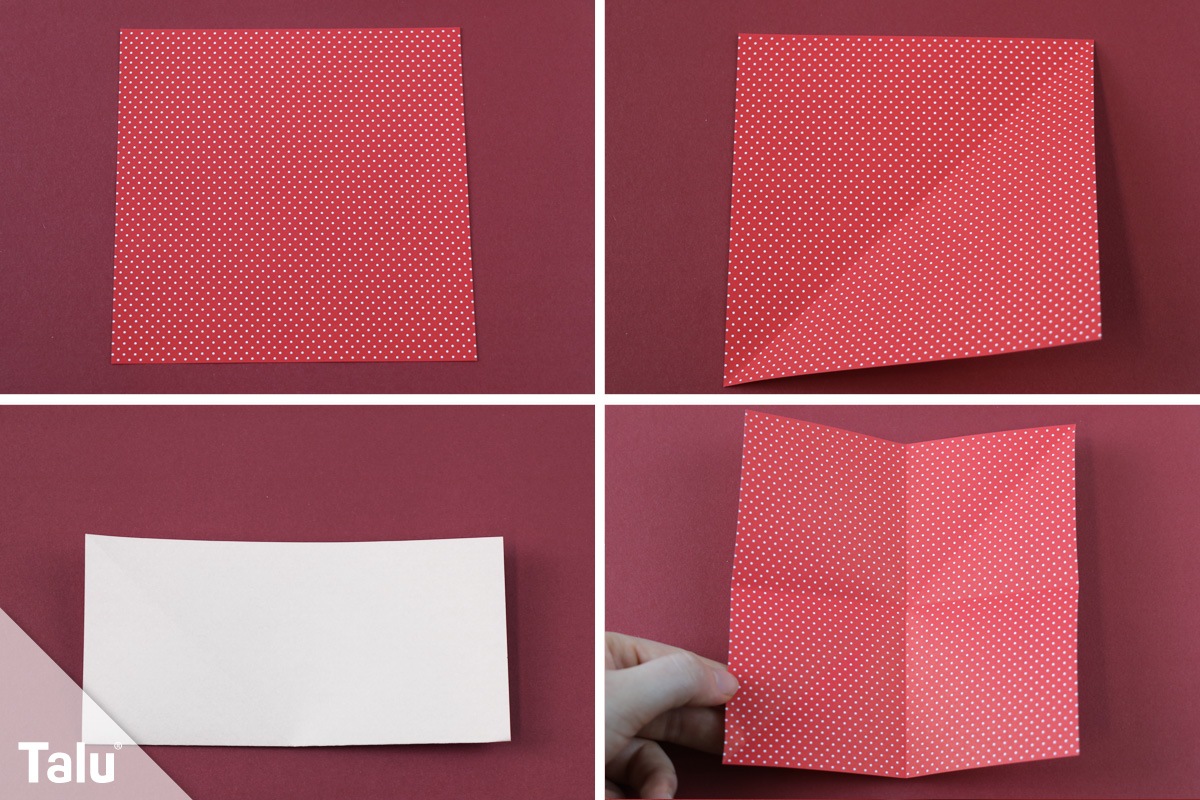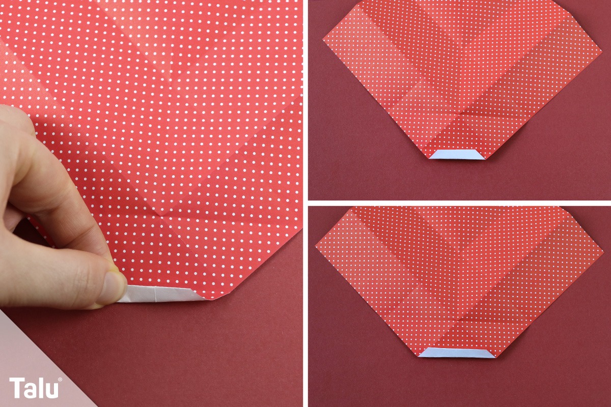 9. Schritt: Drehen Sie das Papier zurück auf die Rückseite und falten Sie das Papier, wie auf den Bilder zu sehen ist, zusammen.