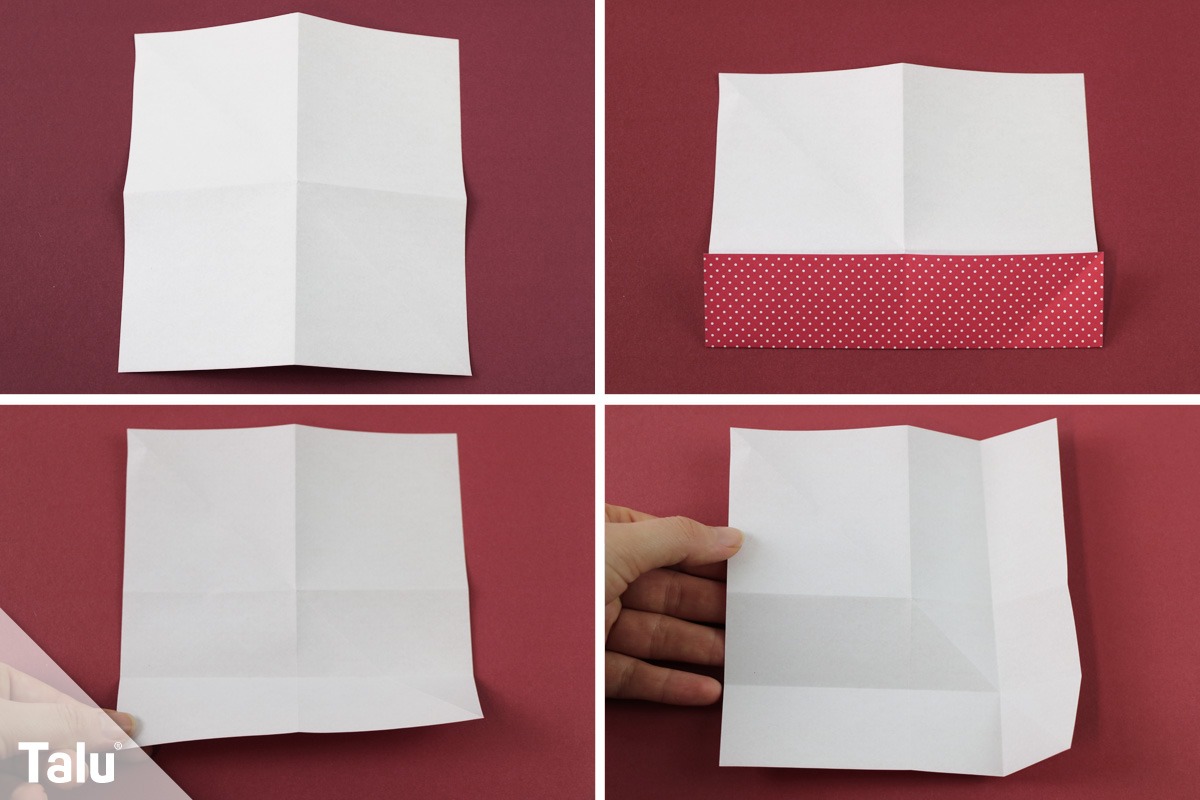 3. Schritt: Klappen Sie jetzt die untere Kante nach oben hin zur Mittellinie. Diesen Falz öffnen Sie danach wieder. Anschließend falten Sie die rechte Kante hin zum senkrechten Mittelfalz.