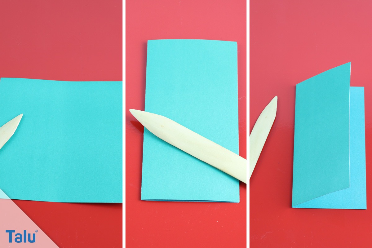 3. Schritt: Jetzt falten Sie den Tonkarton in der passenden Größe, (A4- oder A5-Format) mittig zusammen, dass daraus eine Klappkarte wird.