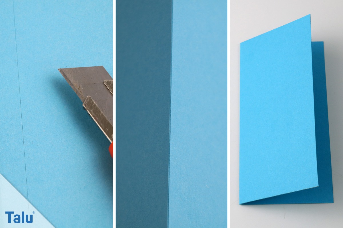 Wenn Sie jedoch etwas stärkeres Material verwenden, lässt dieses sich meist nicht so gut falten und falzen. Hier können Sie mit einem Cuttermesser auf der Rückseite (Außenseite) des Kartons und einem Lineal, den Karton vorsichtig anritzen. Schneiden Sie den Karton auf gar keinen Fall durch!