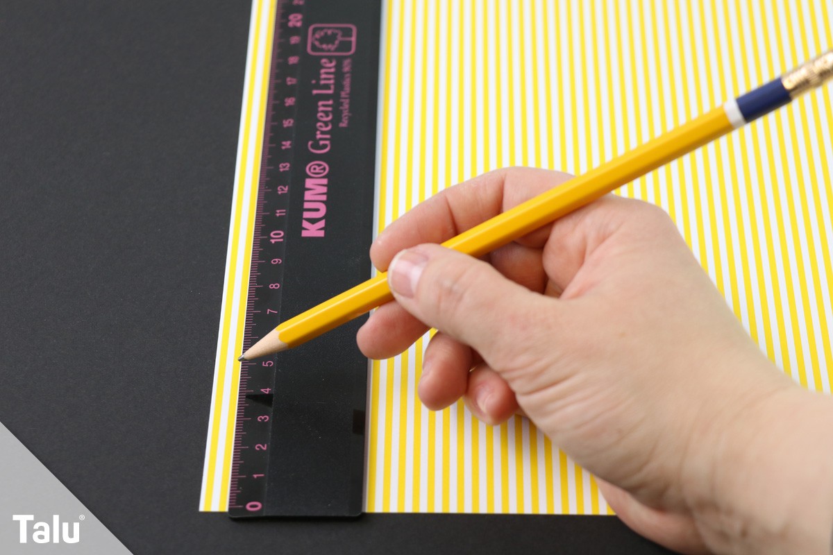 Schritt 2: Jetzt kommt das Muster- oder Tonpapier zum Einsatz. Auf dieses zeichnen Sie die Maße an. Die Karte hat ein A5-Format, hierfür zeichnen Sie eine Höhe von 21 cm und eine Breite von 14,7 cm auf das Papier.