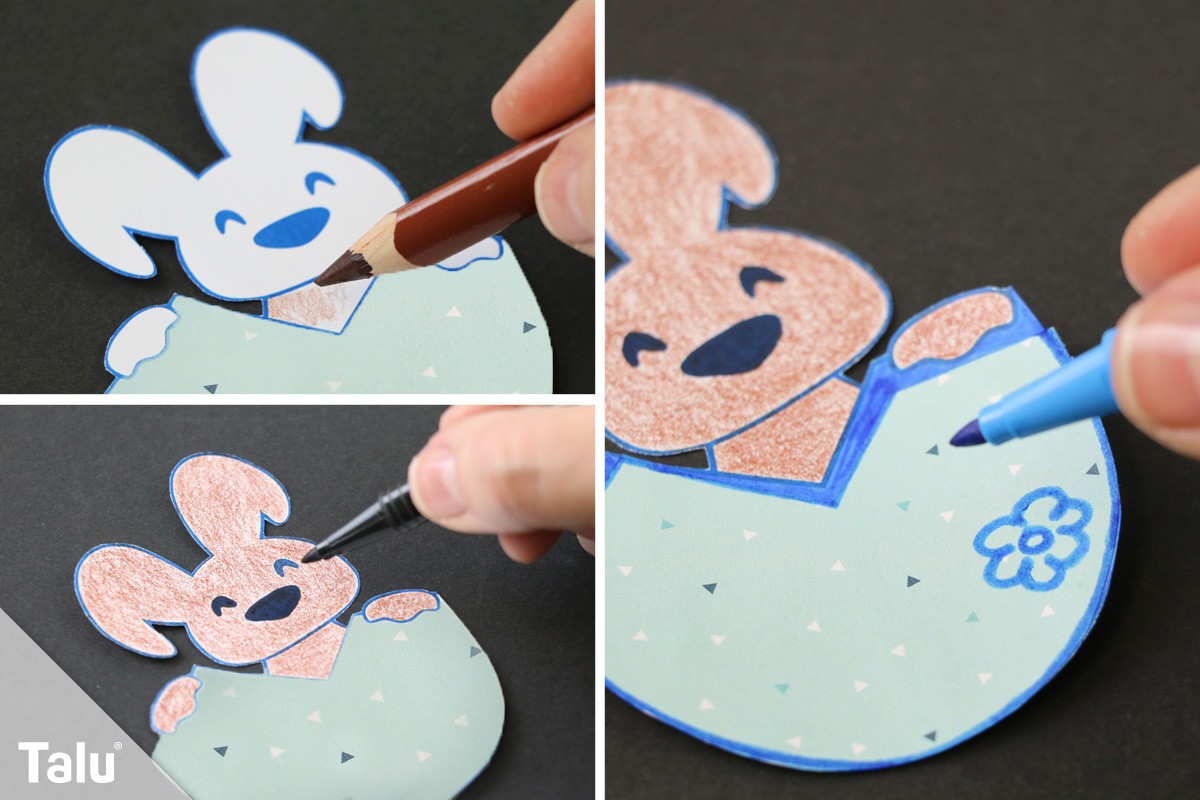 Schritt 5: Malen Sie jetzt mit Buntstiften Ihre Hasen-Osterkarten-Vorlage aus. Mit einem schwarzen Faserstift können Sie Augen und Nase schwarz nachzeichnen.