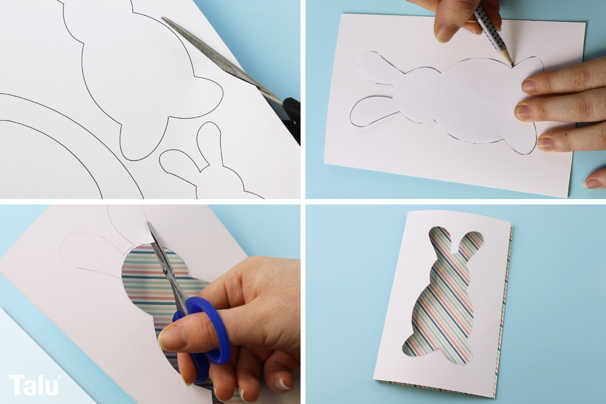 Tipp: Sie können auch bunte Papierstreifen, Washi-Tape oder Spitze von innen gegen das Motiv kleben. Lassen Sie ihrer Kreativität einfach freien Laufe – Sie werden begeistert sein, welche bunten Osterkarten sich mit dieser Technik gestalten lassen.