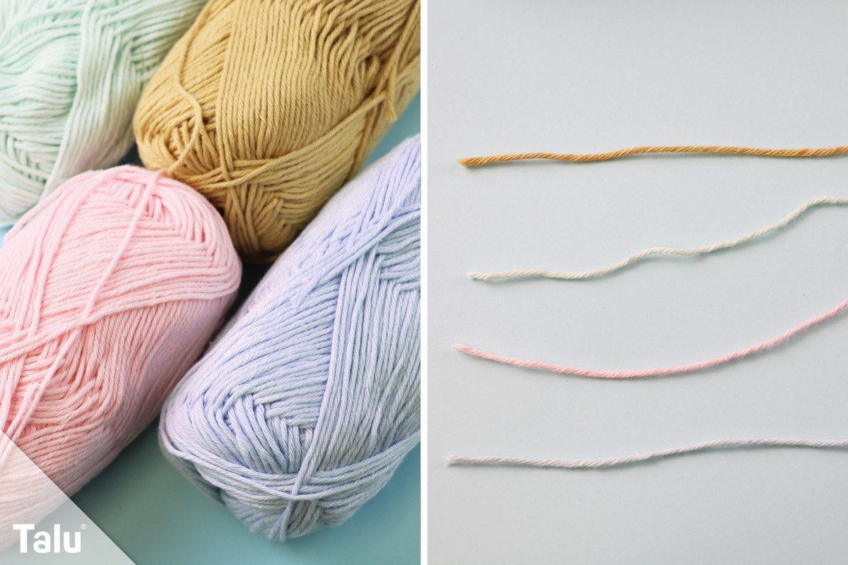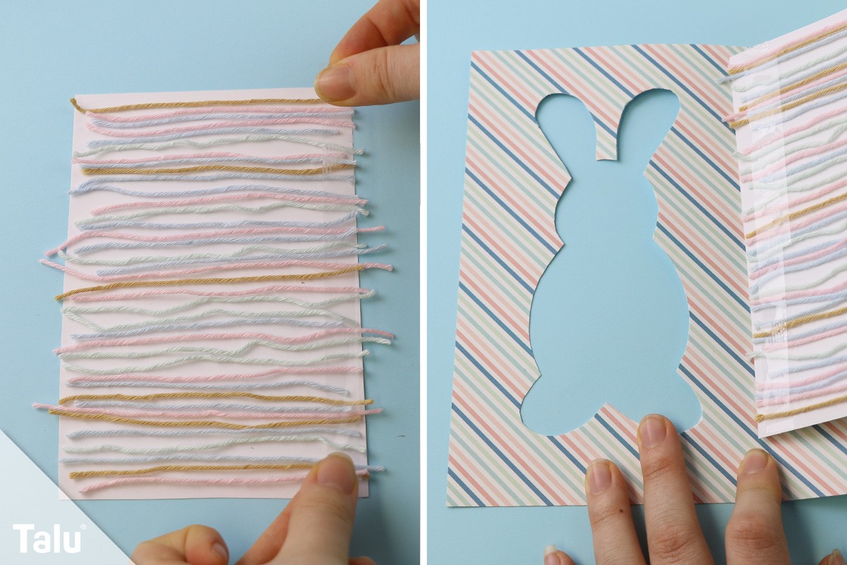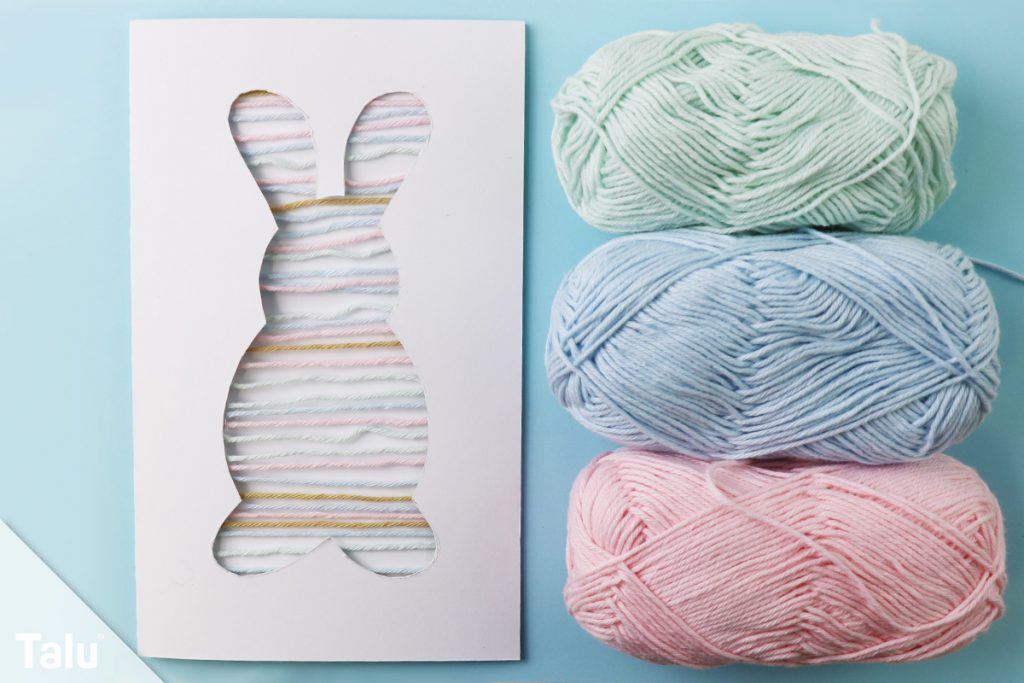 6. Schritt: Nun benötigen Sie viele Wollfäden in bunten und österlichen Farben. Schneiden Sie diese auf die Breite der Osterkarte zurecht – ein kleines Stückchen kleiner.