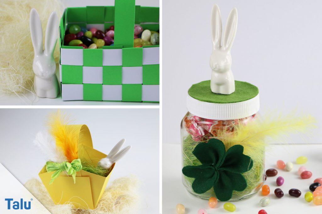 Zum Schluss noch eine weitere Anregung, wie Sie ein simples Osternest selber basteln können: „Verstecken“ Sie die Naschereien und sonstigen kleinen Geschenke doch einfach in einem leeren Glas mit Deckel – eine schnelle und kostengünstige, aber dennoch hübsche Methode.