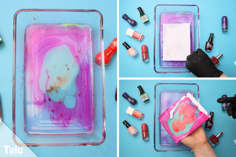 3. Schritt: Wenn Du mit der Marmorierung der verschiedenen Farben zufrieden bist, nimmst Du ein Blatt Papier zu Hand, welches vom Format gut in die Schale passt. Lege das Papier vorsichtig auf die Wasseroberfläche. Lass das Papier dann für einen Moment im Wasser schwimmen. Anschließend ziehst Du das Blatt, am besten mit Handschuhen, aus dem Wasser zur Seite hinaus. Durch die seitliche Zugbewegung bleibt die Lackschicht auf dem Papier kleben.