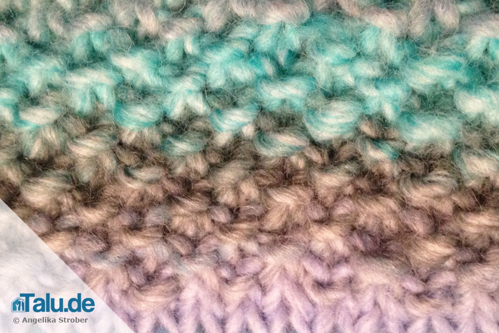 Es ist schnell gestrickt, denn nur rechte und linke Maschen wechseln einander ab. In der Rückreihe werden die Maschen nicht in der gleichen Weise gestrickt, wie sie erscheinen, sondern dem entgegengesetzt. Auf eine rechte Masche kommt damit eine linke und umgekehrt.