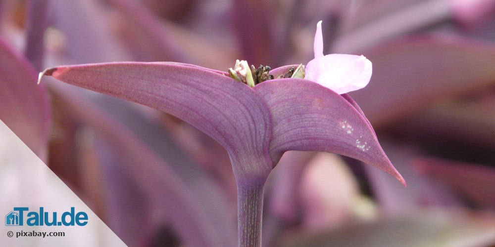 Bei der Mexikanischen Dreimasterblume handelt es sich um eine krautige, sehr ausdauernde Pflanze mit dunkelgrünen bis lilafarbenen Blättern. Das leuchtende Lila der Belaubung zeigt sich jedoch nur, wenn sie in der vollen Sonne kultiviert wird, also an einem Südfenster. Je geringer die Sonneneinstrahlung, umso eher wird das Lila von einem Dunkelgrün verdrängt. Schaden tut dies jedoch nicht. Bei guter Pflege bildet die Pflanze an den Enden zahlreiche kleine rosafarbene Blüten.