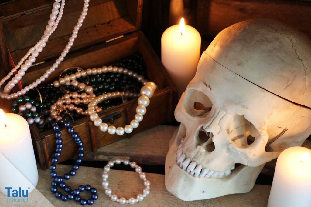 6. Schritt: Während einfache Piraten auch mit einem nach hinten gebundenen Kopftuch Vorlieb nehmen, geht ein Kapitän nicht ohne Hut von Bord. Entweder Sie kaufen ein entsprechendes Modell aus dem Kostümbedarf oder Sie richten einen alten schwarzen Hut entsprechend her. Per Textilfarbe ließe sich ein Totenkopf darauf malen. Zudem könnten Sie Goldketten um das Innere winden. Mit entsprechender Vorlage gelingt auch ein gebasteltes Modell aus Pappkarton: Einfach Kopfumfang messen, Umriss in passender Größe auf großen Karton bringen, ausschneiden und verzieren. Mit einem Tacker oder Gummiband können Sie Ihre Hutimprovisation verschließen – und vielleicht auf der Feier ein neues Stück erbeuten. Schließlich sind Sie ein Pirat!