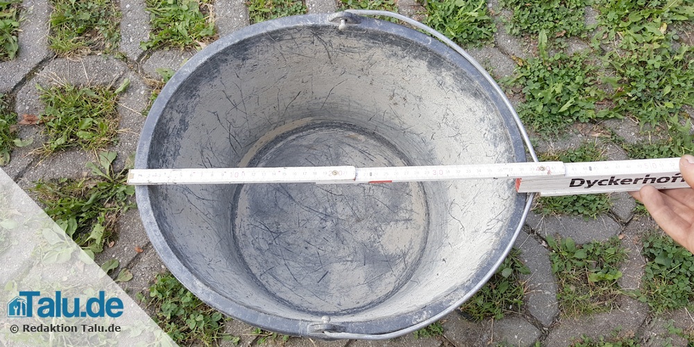 Gerechnet wird immer die Breite x Tiefe x Höhe. Also 0,2 x 0,2 x 0,6 für unser erstes Beispiel. Für einen runden Eimer rechnen Sie den Durchmesser mal 3,14. Wie Sie sehen, kommt aber auch bei einem großen Eimer keine besonders üppige Menge zusammen. Es lohnt also meistens, die benötigten Punktfundamente selbst zu mischen.